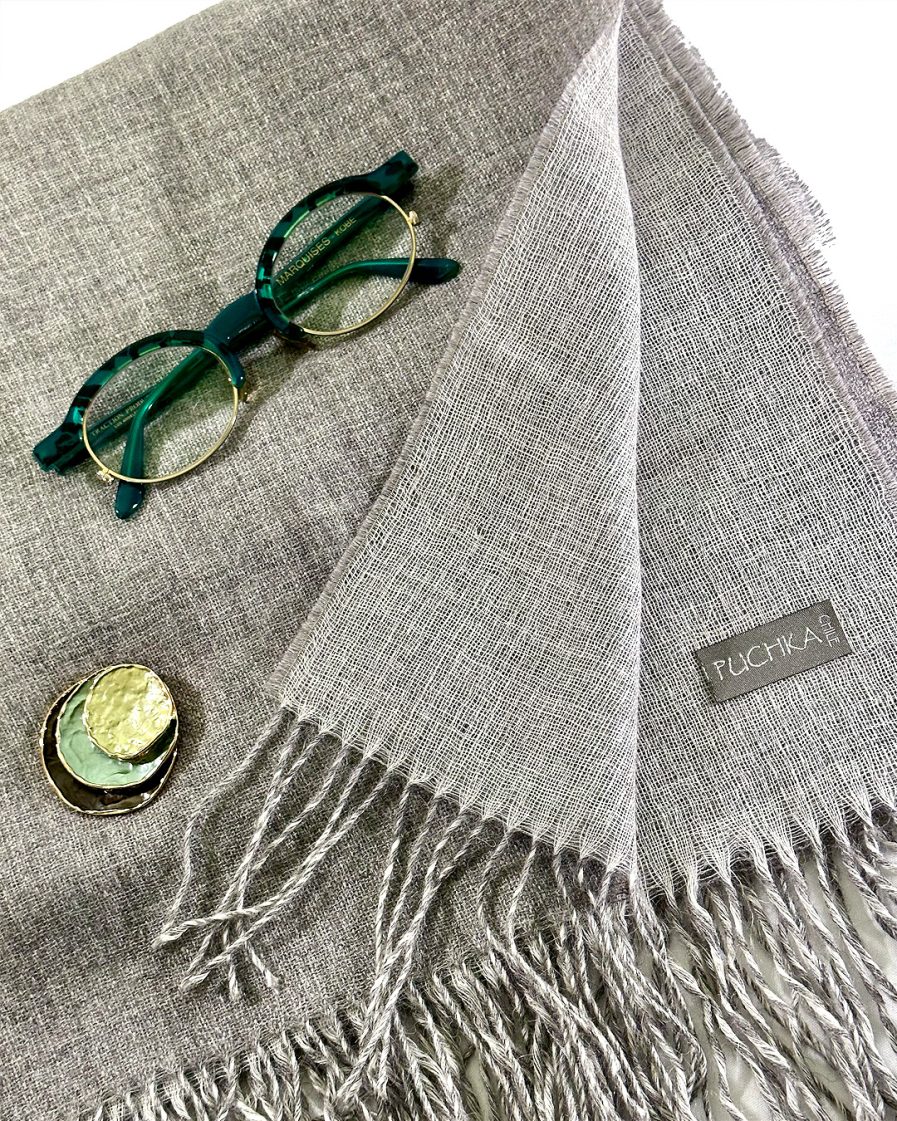 Fino chal de baby alpaca-seda, doble faz en 2 tonos de grises claros.